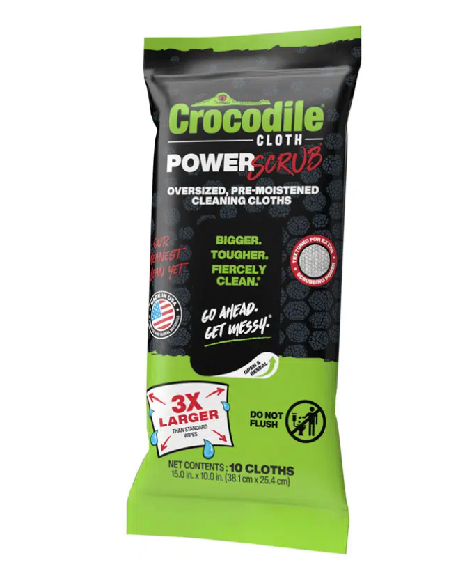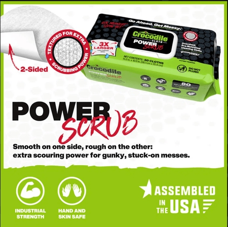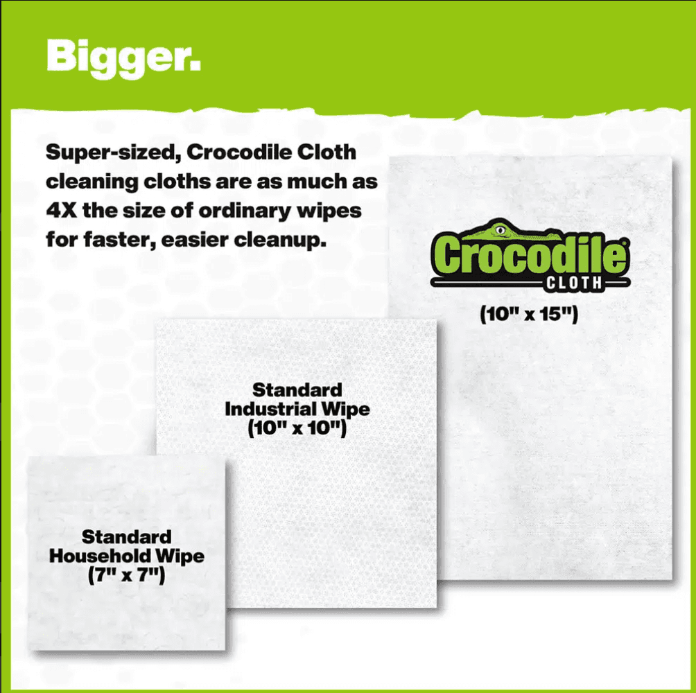 NO MORE WIMPY WIPES: These oversized wipes aren’t just tough on messes, they’re incredibly strong and are no match for the competition. Crocodile Cloth® are 3X larger than standard wipes and are proudly Made in the USA of domestic and imported materials.