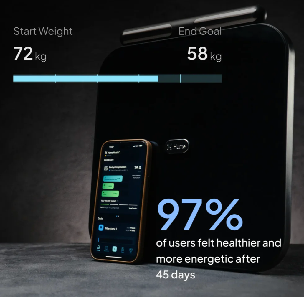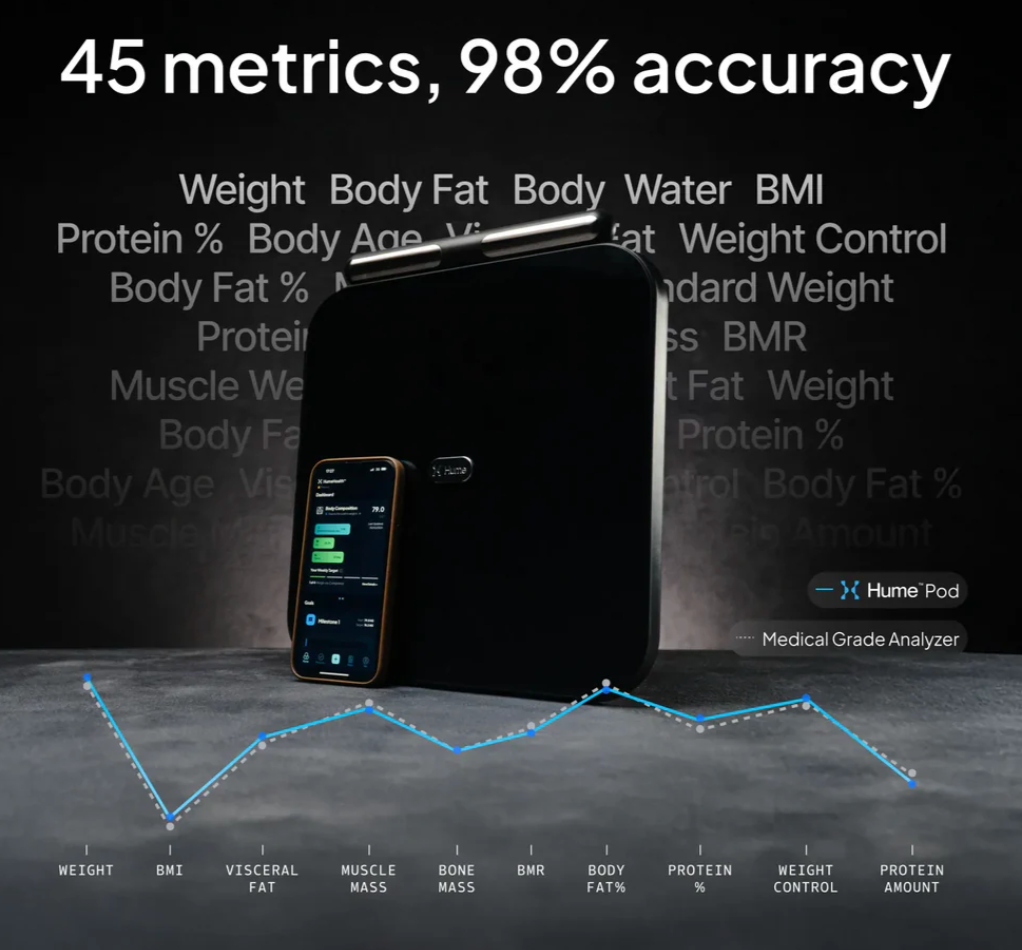 Hume states it measures 45+ metrics, including fat mass, muscle mass, visceral fat, body water, and segmental distribution.