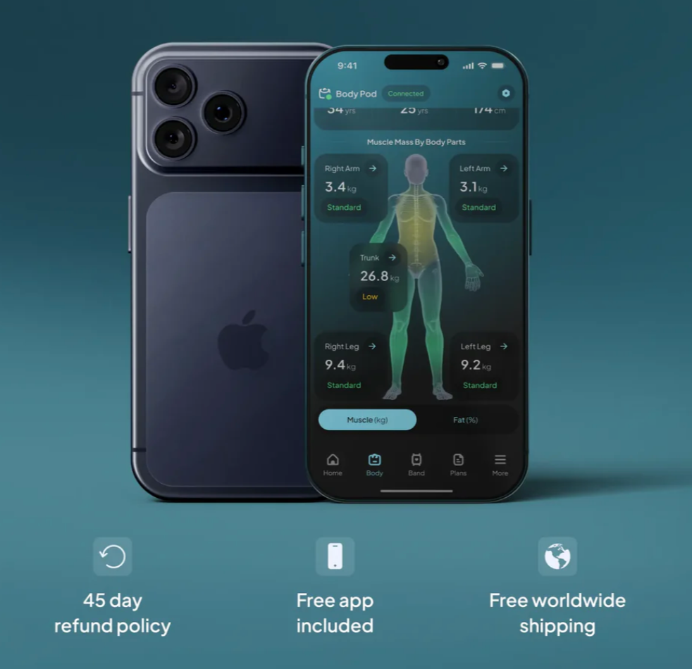 The Body Pod is a full-body composition analyzer (smart scale + handles) that scans your body in ~60 seconds and tracks 45+ metrics—so you can see fat loss vs. muscle gain vs. water changes (not just “weight”).