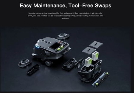 - Tool free modular design for dust mop, dust bin, trash bin, roller brush and side brushes